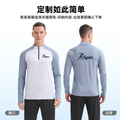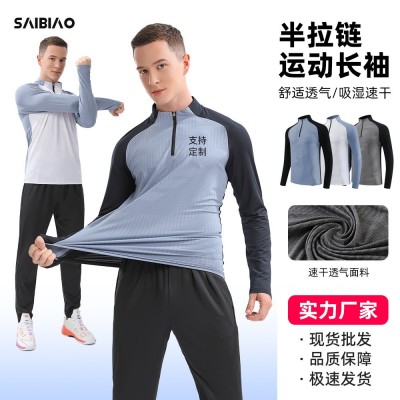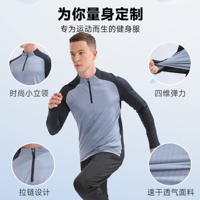 跑步运动长袖上衣秋季男立领半拉链撞色插肩袖健身训练弹力速干衣